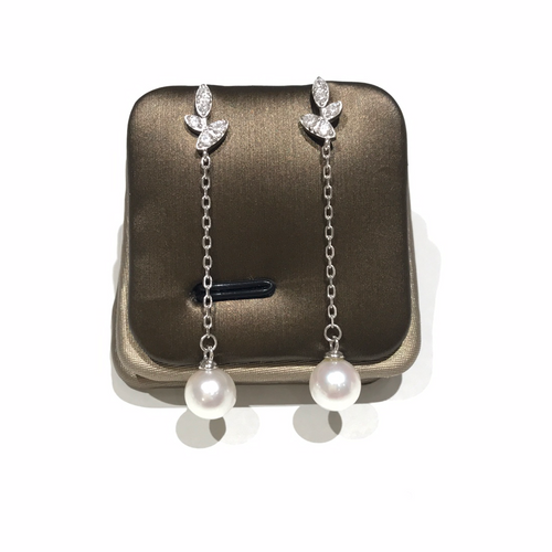 Sterling Silver Leaves long Akoya Sea Pearl Earrings